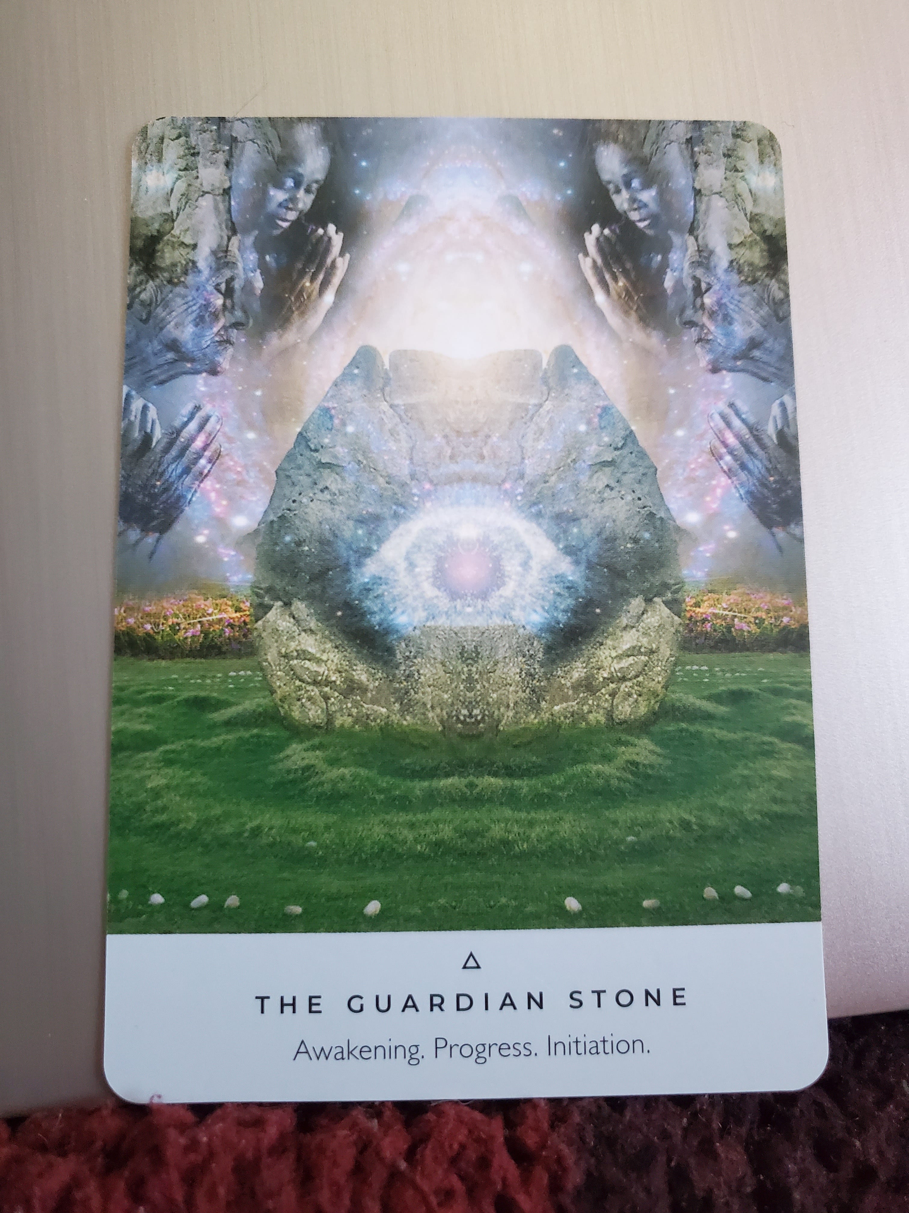 Today’s card, the Guardian Stone, arrives with the themes of awakening, progress, and initiation. The imagery shows a radiant stone encircled by what feels like ancestral presence. When I look at it, the stone resembles a tulip just before blooming — a moment suspended in time, full of promise.
